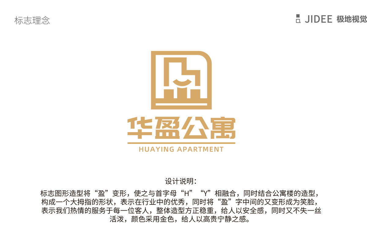 品牌介紹 :華盈公寓logo設計,標志圖形造型將“盈”變形,使之與首字母“H”“Y”相融合,同時結合公寓樓的造型,構成一個大拇指的形狀,表示在行業(yè)中的優(yōu)秀,同時將“盈”字中間的又變形成為笑臉,表示我們熱情的服務于每一位客人,整體造型方正穩(wěn)重,給人以安全感,同時又不失一絲活潑,顏色采用金色,給人以高貴寧靜之感。