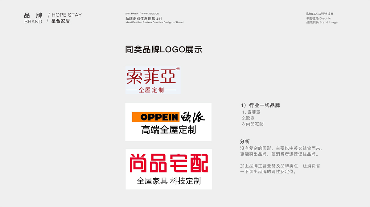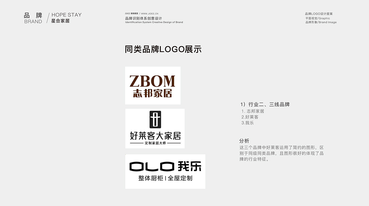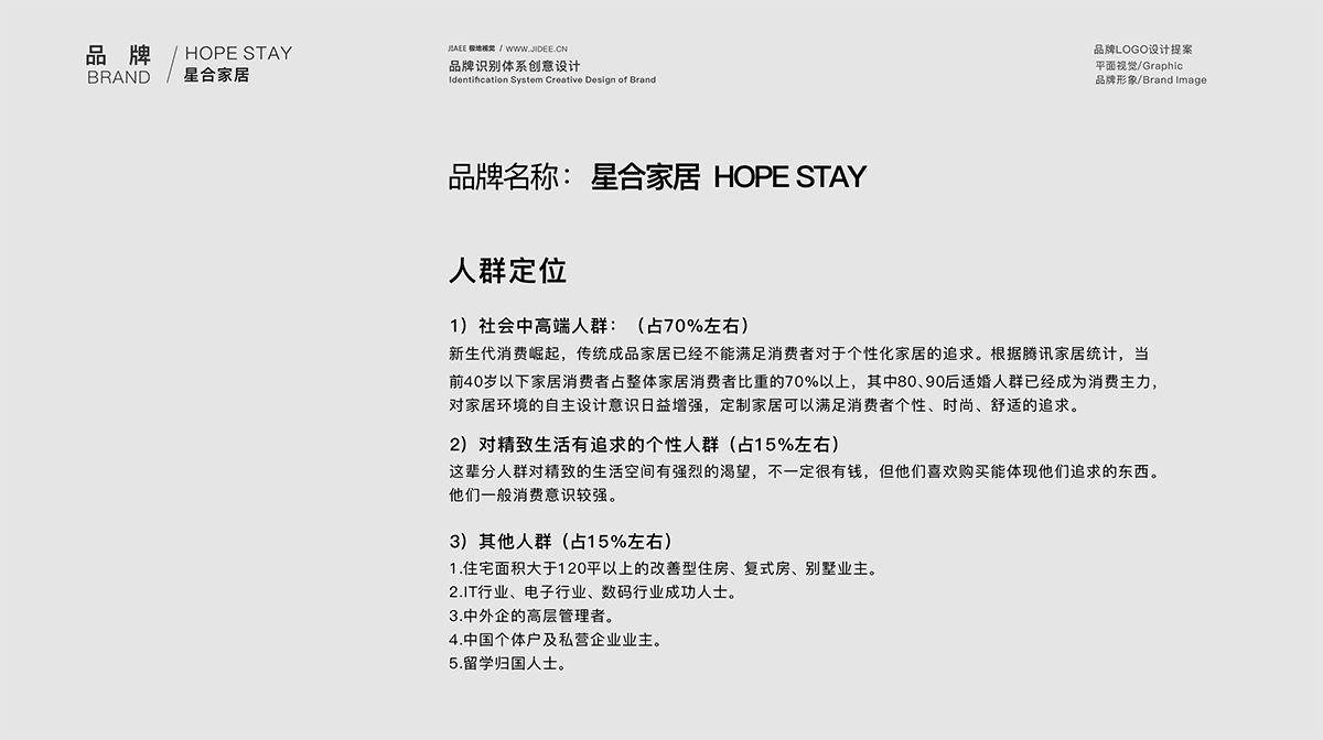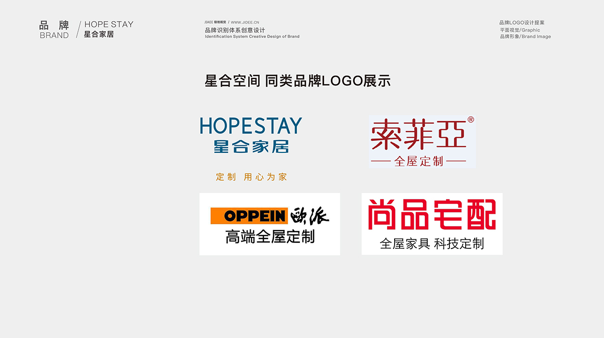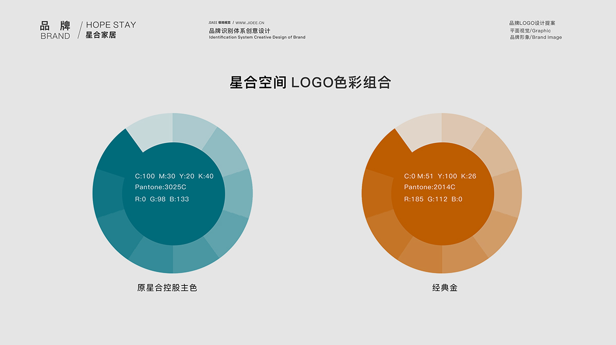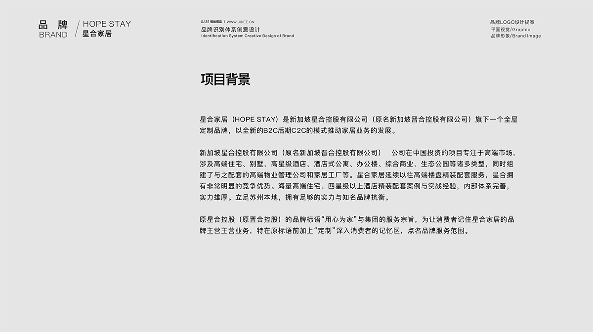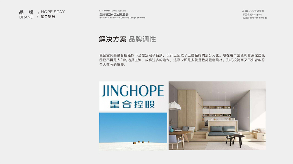 Logo為“星合家居”中英⽂的組合。“星合家居”四字字體與晉合家居的中⽂字體保持⼀致, logo主體⾊也采⽤了晉合家居logo的 主體⾊,體現出本品牌是晉合旗下的⼦品牌且與晉合家居的緊密聯系。 ⼆、通過版式的設計增加視覺層次感,利⽤字體的缺省設計達到加深品牌記憶的⽬的,給⾜想象空間,具有強⼤的品牌包容性。配⾊ 采⽤原星合控股的主⾊調配上復古的⾦⾊搭配,沉穩厚重的⾊系給⼈以信賴感。與⻄⽅⽂化進⾏結合,體現品牌的國際化。