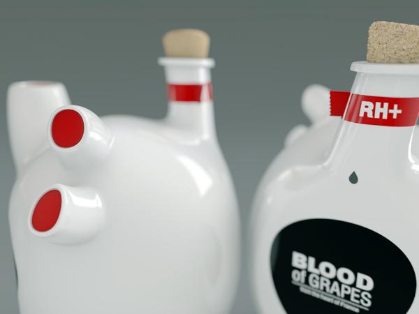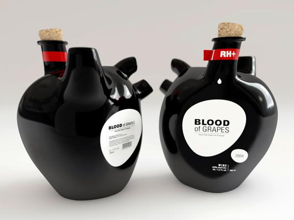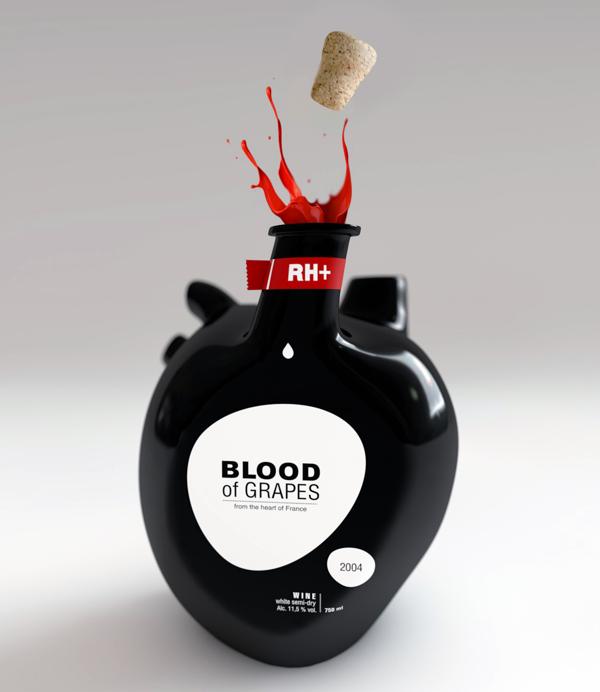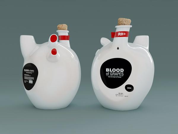 法國BLOOD of GRAPES品牌葡萄酒特色包裝設計,葡萄酒是葡萄的血液,心臟是它的容器。口號“法國的心臟”支持整個設計概念。