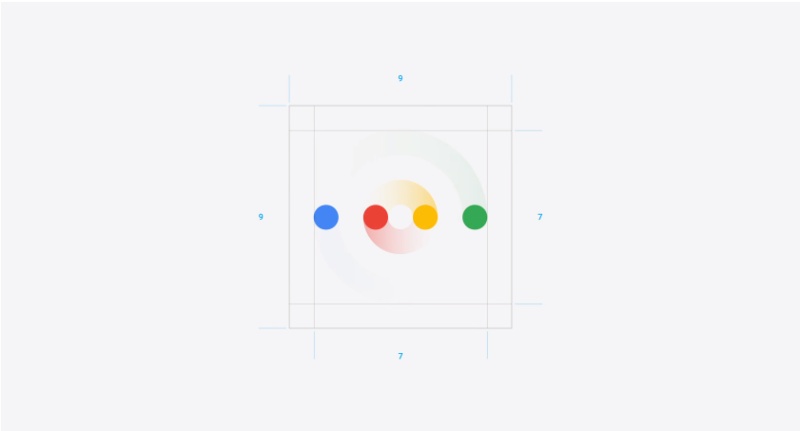 Google G是直接來源于logo中的”G”,但是針對小尺寸的顯示而比 logo 中的 G 具有更大的字重。它被設計在同樣的網格中,作為我們的產品圖標符號。這個圓形被升華為防止視覺上的“重復”。“G”中的色彩比例包含了logo中的全部顏色,顏色的順序能幫助人眼圍繞字母運動。這些點沿著幾何弧線運動,遵循了一套曲線優雅運動的標準。