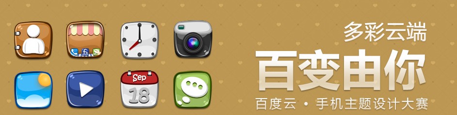 多彩云端、百變由你——首屆百度云・手機(jī)主題設(shè)計(jì)大賽開始啦!本次大賽旨在給優(yōu)秀的設(shè)計(jì)者們提供一個(gè)施展才華的舞臺,同時(shí),為百度云ROM的眾多用戶帶來更豐富、更多彩、更具創(chuàng)意的手機(jī)桌面主題。