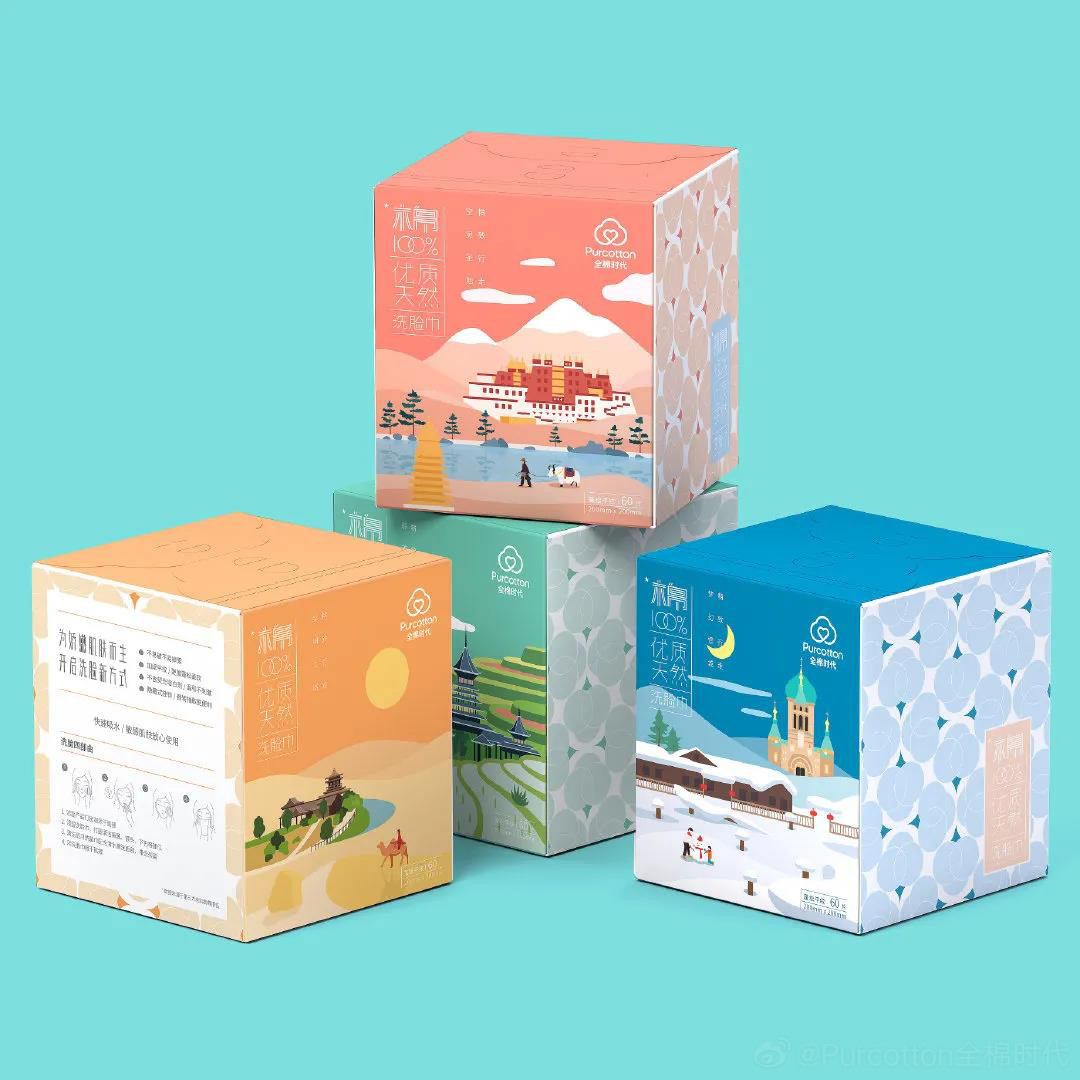 包裝延續(xù)品牌小清新的設計風格,結合四季色調(diào)的畫面呈現(xiàn),描繪了布達拉宮、貴州梯田,以及敦煌石窟、東北雪鄉(xiāng)四大經(jīng)典美景,進而拉近與消費者的情感距離。側面包裝還印有整齊排列的棉花元素,使得畫面更加充盈的同時表明了產(chǎn)品的品牌調(diào)性,視覺上也更顯溫柔、細膩。