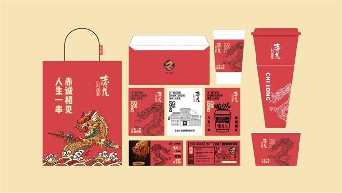 這個炸串品牌叫赤龍炸串圍繞赤龍的品牌名,原創手繪出一條翻江倒海,爪持串物的龍形象,LOGO設計是中文字體和拼音的結合,赤龍二字用毛筆揮斥而成。赤龍的拼音在和串屋二字連結,重在突出赤龍的品牌名稱。輔助圖形采用日式匠心經典“燒鳥”造型,結合本地傳統炸串演繹誕生出新一代解饞美味。不論是獨自一人釋放對食物垂涎的欲望,還是與老友相聚發泄日常生活的某種情緒,擼串無疑是釋放的最佳途徑,所以赤龍炸串提出了人生一串,赤誠相見的廣告語。