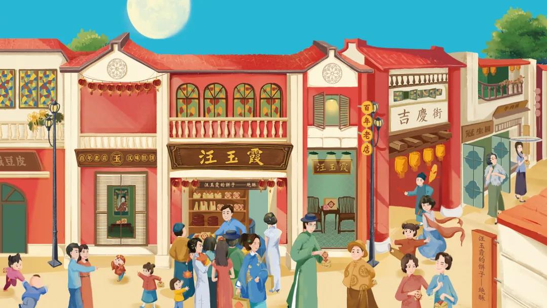 這款中秋禮盒包裝,首先外觀插畫采用了明快、簡潔的風格,描繪民國時期的商業街、小洋樓、,紅墻坡頂、雕花欄柱及彩繪玻璃等元素,再現那個時代的繁華景象。