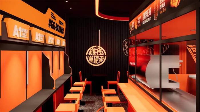 努努雞的物料設計很多變,延伸出來的輔助圖形很是炫酷,就很容易抓住人的眼球。由于炸雞多出現在美食街,所以努努雞也做了攤點設計,方形的攤點貼著努努雞的海報和各類輔助圖形,是相對簡單但又很亮眼的存在。努努雞店面設計體現了對稱美學,以中間的吧臺為主,兩邊的桌椅對稱排布,和努努雞所傳達的干脆點不謀而合。店內還是以大面積的橙色為主,包括吧臺、墻面和椅子等,這就讓進店吃炸雞的人,感到熱血沸騰,不再猶豫且充滿了能力。不管是物料設計還是空間設計,努努雞將輔助圖形用的非常多,這就給人這個IP很飽滿的樣子。