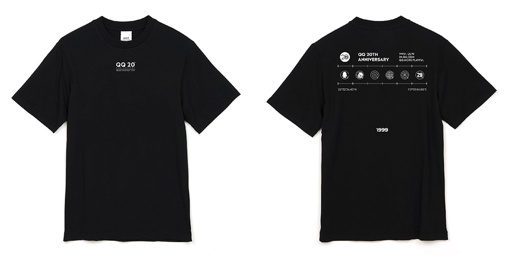 T恤的圖案從QQ20周年logo圖形中延展設(shè)計(jì)出各類代表圖形,正面簡潔直接地顯示出本次主題,把醒目的圖形放置于T恤背后,利用坐標(biāo)軸和經(jīng)緯度的信息圖案配合各個(gè)抽象化的宇宙元素,增加T恤設(shè)計(jì)的科技感,更明確地展現(xiàn)了科技向善的愿景。