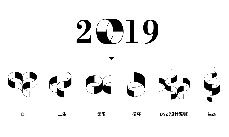 主視覺設(shè)計借用“可持續(xù)”的概念,從設(shè)計元素的可持續(xù)出發(fā),從年份“2019”中提取“0”,設(shè)計了一套專屬字體,并在字體的基礎(chǔ)上設(shè)計了一組圖標(biāo),代表著不同的寓意。