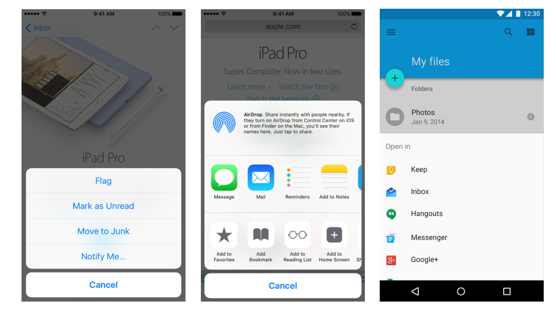 左:iOS彈出框; 中、右:MD簡易菜單