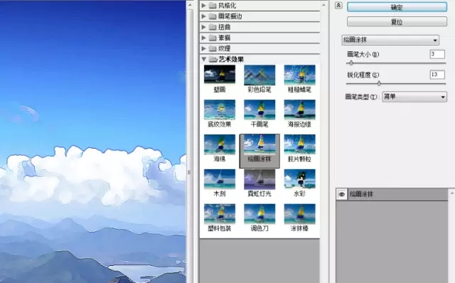 4.這個時候呢復制一層背景圖片把圖層提到干畫筆圖層上面后再添加濾鏡-濾鏡庫-繪畫涂抹效果