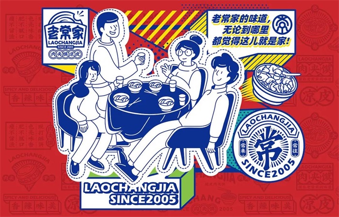 老常家肉夾饃,緣起于地道陜西美食,幾十年來(lái)堅(jiān)持手工打饃,精選優(yōu)質(zhì)上等好豬肉每日小伙慢燉,饃焦香酥脆,肉肥而不膩,瘦而不柴。此次品牌設(shè)計(jì)是對(duì)老常家品牌的15年經(jīng)營(yíng)的一個(gè)提升。LOGO的形狀是一塊出爐打包好的肉夾饃,饃被咬了一個(gè)小口,包裝紙平面里置放著老常家三字,字體線(xiàn)條下意識(shí)往下垂凹,使其與其他字體樣式區(qū)別開(kāi)來(lái),品類(lèi)標(biāo)識(shí)用多個(gè)圓圈圈起來(lái),對(duì)應(yīng)上肉夾饃的形狀。輔助圖形利用標(biāo)志和品類(lèi)結(jié)合幾何圖形來(lái)塑造,是當(dāng)下眾多餐飲品牌會(huì)使用的一種輔助圖形設(shè)計(jì)方式,意在更好的傳達(dá)品牌的優(yōu)勢(shì)和賣(mài)點(diǎn)。