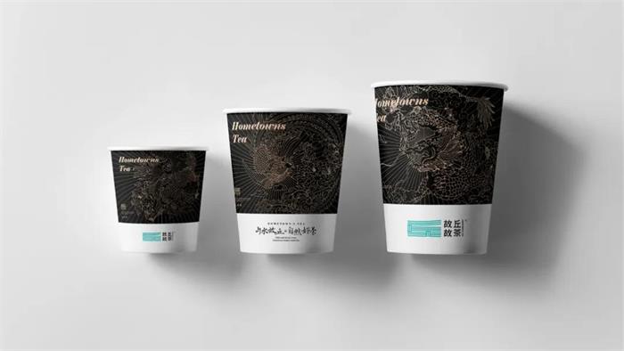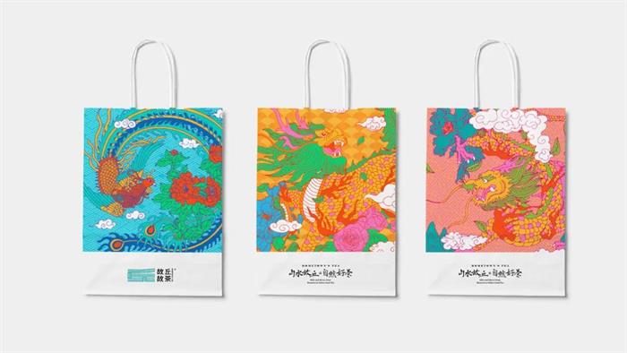 這個茶飲的名字就很古風,品牌的視覺設計主要用插畫來表現。龍與鳳的圖案作為元素,在花和云騰的背景融為一體。最大的賣點在于顏色的搭配,幾種艷麗的顏色調低飽和度,撞色的手法看起來很出彩。圖案的處理使用線描的方式,用新式的國潮風格來演繹,像這樣中國風的茶飲外表還是很引人注意。去掉顏色,又是一番風景,反差色的多線條設計很密集,勾勒出來的圖形顯得很有氣勢。