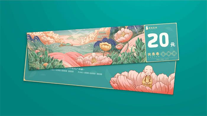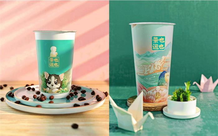 茶也運也是一個茶飲品牌,名牌名稱的含義為:獻上一杯好茶再祝福大家一生好運。是一個很正向的愿景。而由一個小和尚來傳達這種祝福,再合適不過了,所以茶也運也的LOGO圖案是選擇了小和尚的形象。圖案選擇了以小和尚的側面來展現,小小一團跪坐在地上,手里拿著茶壺作倒茶姿勢,整一個形象看起來圓滾滾的,非常可愛!茶也運也的字體部分框于外輪廓為黃色,背景色為青色的方形中,字體線條和小和尚的形象一樣,是圓滑且帶著點歪扭的,禪意又靈性。而之所以選擇黃色和青色這樣的顏色結合,是因為國潮風格里,這兩種顏色常常是伴隨著一起出現的,加上白色的過渡,會使整個品牌形象設計更加和諧豐滿。茶葉運也的輔助圖形由小和尚、插畫、樹葉以及飲料瓶等元素組成,用簡筆畫的方式展現出來,增添了不少可愛的氣息茶飲菜單設計成塔牌的形式,產品圖采用手繪的方式展現,看起來清新香甜。然而其國潮插畫才是此次品牌設計的最大亮點,這組國潮插畫繪制很是精美,對于山水場景的刻畫恢弘大氣,對于動物人物的理解,也比較獨特。每幅插畫都有特定的故事。