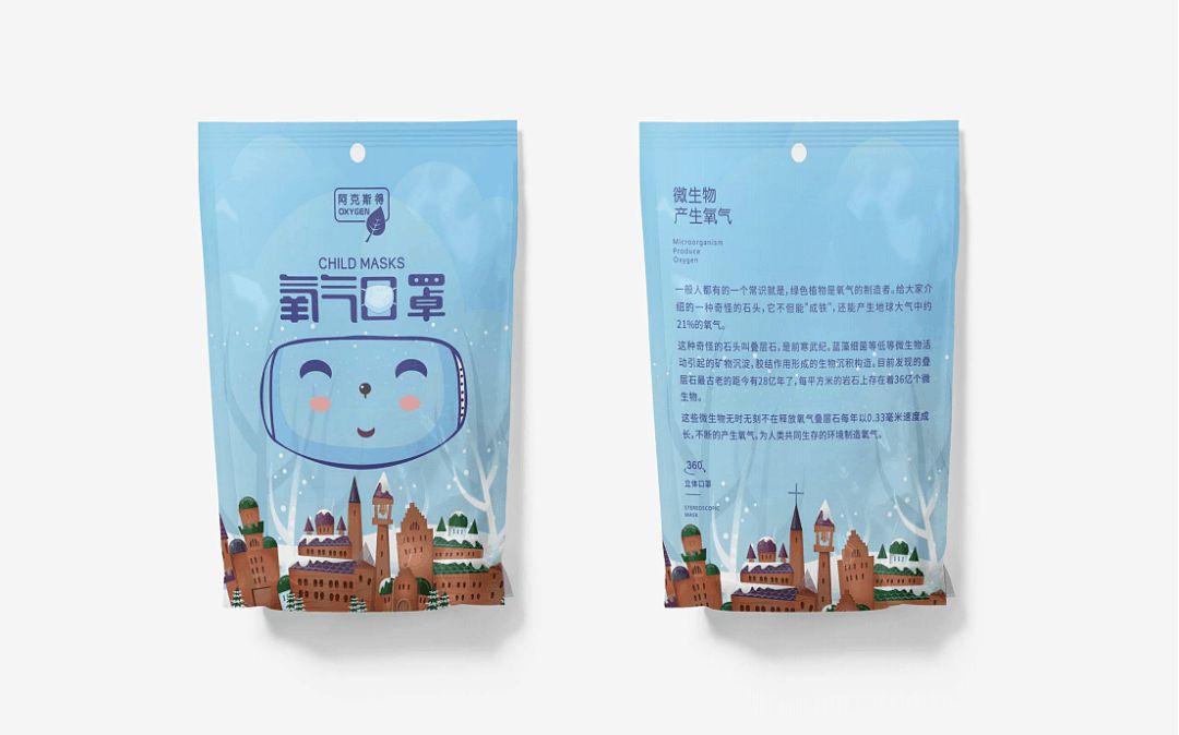 冬季飄雪的故事性場景插畫設(shè)計(jì),配以歐洲風(fēng)情的城堡元素,口罩包裝也更加唯美動(dòng)人,包裝中央的笑臉設(shè)計(jì),仔細(xì)一看其實(shí)是口罩的輪廓形象,暗藏玄機(jī)的IP描繪卻也親和感十足。