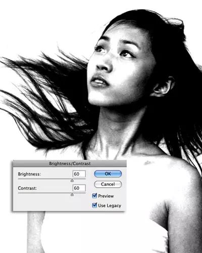 選擇被復制的圖層,點擊圖像>調整>亮度/對比度,在不減少發絲的前提下,盡可能地調高亮度和對比度。理想狀態下,可以將背景調成純白色,而頭發為純黑色。