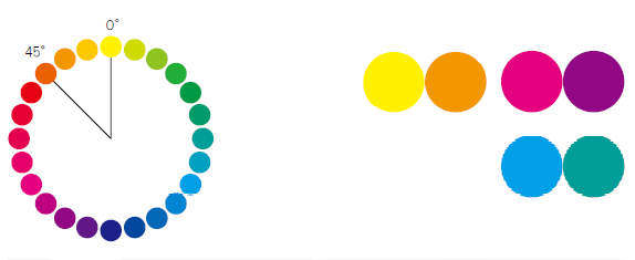 類似色配色方案由色相環中形成90°角內的不同色相以一定順序顯示,在明度和飽和度上可呈逐層漸變的配色方案。