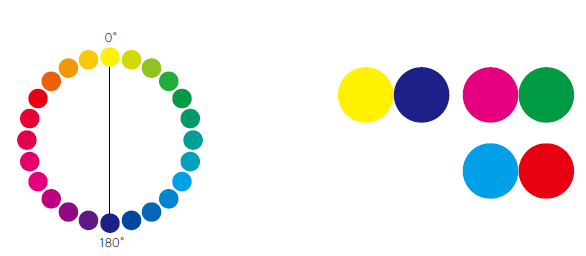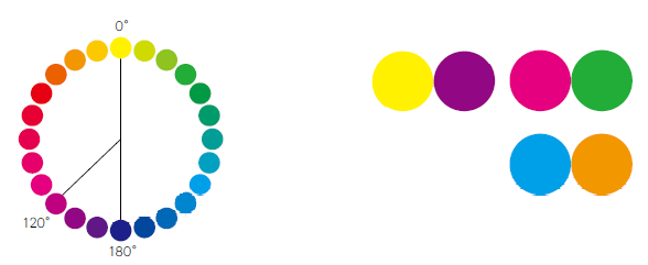 色環上色相間的夾角在120°到180°之間是強對比,這樣的對比看上去鮮明活潑且形成強烈的視覺沖擊,但如果處理不當的話可能會帶來視覺疲勞、不安全感和不協調感。