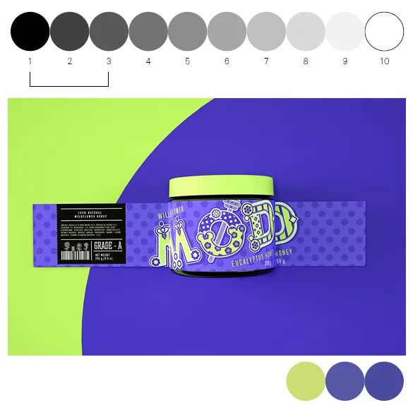 3個色階間的明度差的顏色對比是明度弱對比。使不同色相的明度一致或相似會產生穩定的視覺體驗。弱明度對比的畫面看上去會顯得簡單和單調。在畫面上增加色相或運用多種色彩的組合能增強畫面的活力并吸引觀眾。